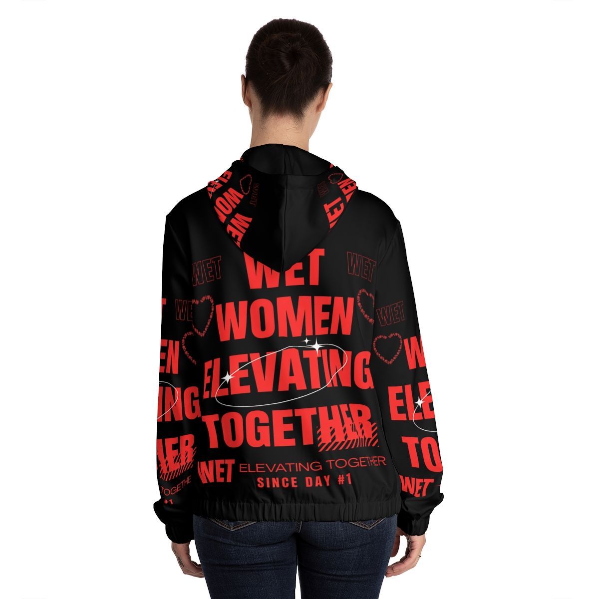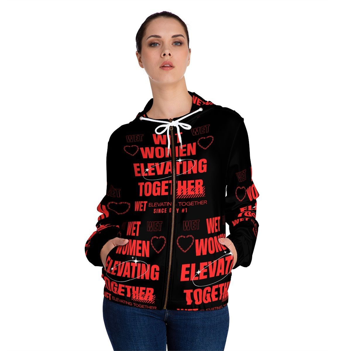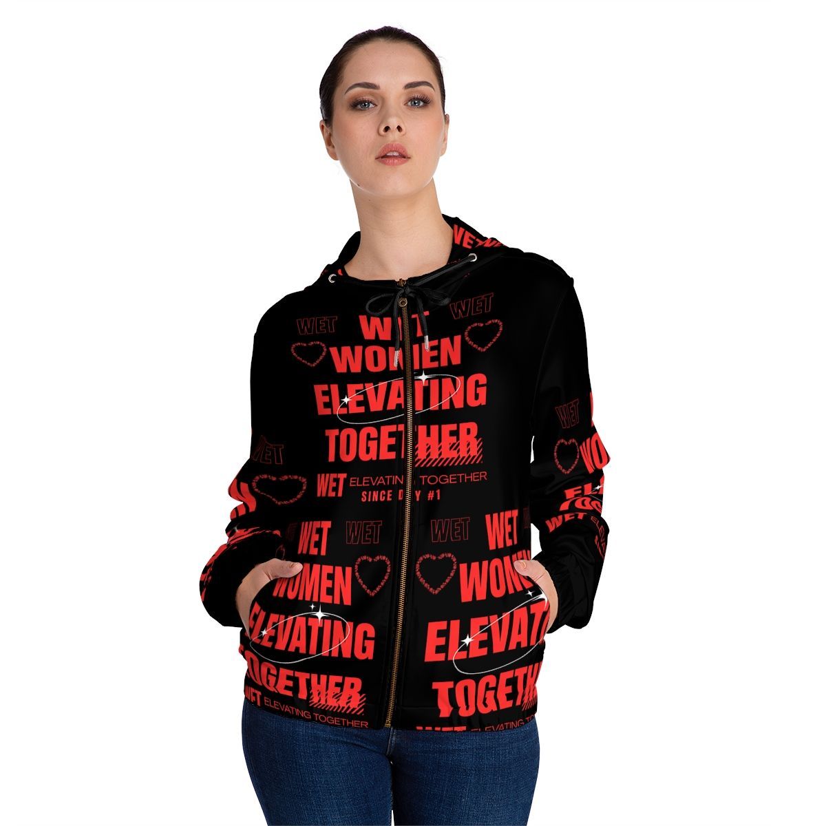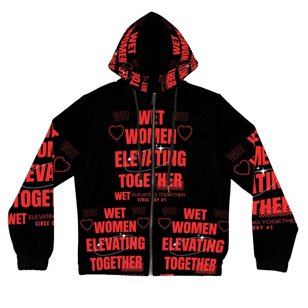 This full-zip hoodie is a bold, community-forward layer made to be seen and felt. The all-over black canvas is stamped with striking red text and heart motifs that read WET • WOMEN • ELEVATING • TOGETHER —a confident statement about solidarity and shared momentum. Lightweight stretch fabric keeps movement easy whether you’re heading to a meet-up, warming up before a workout, or standing in solidarity at an event. The adjustable hood and durable gold-tone zipper add a touch of utility and polish, while the elastic cuffs and hem hold shape through repeated wear. Wear it zipped for a graphic, front-and-center message or open for a relaxed, layered look that still speaks loudly.