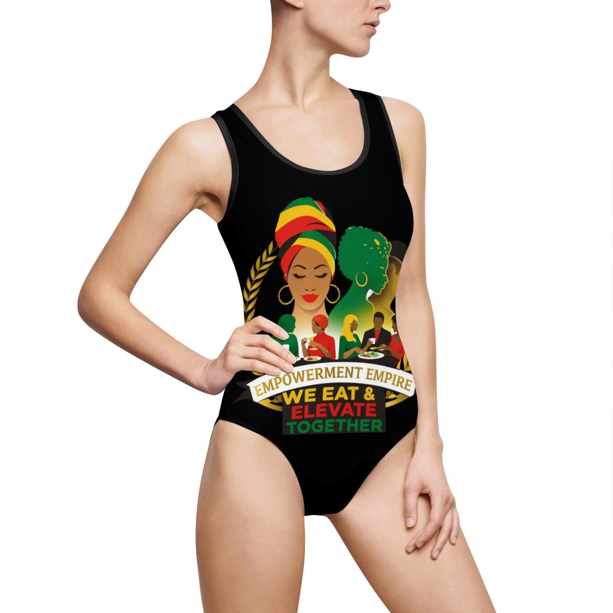 Sink into sunshine and sisterhood with this bold one-piece that celebrates community and culture. The deep black canvas makes the vibrant reggae-inspired artwork pop: a serene, headwrap-clad woman, lush foliage, and a gathering of people beneath the banner “Empowerment Empire — We Eat & Elevate Together.” Wear it to swim, lounge poolside, or move through a summer block party — it reads like a statement and feels like belonging. The cut is classic and supportive, with a U-shaped neckfront and back that flatters the torso and keeps the design centered. Lightweight and stretchy, it moves with you and keeps colors vivid through sun and water, so the message stays loud and proud.