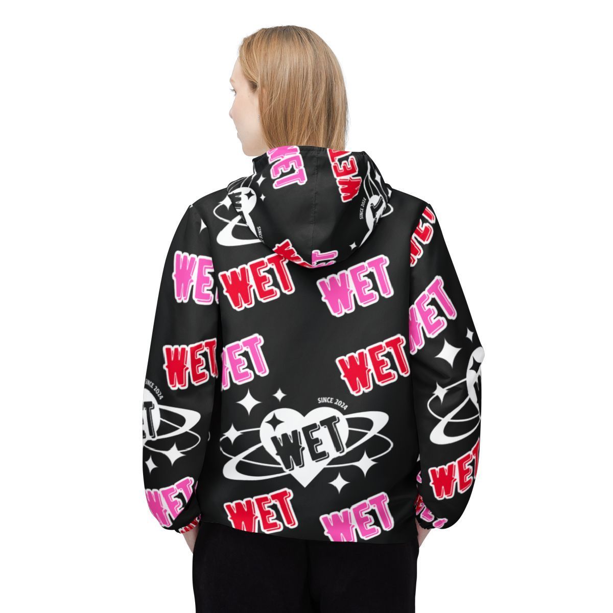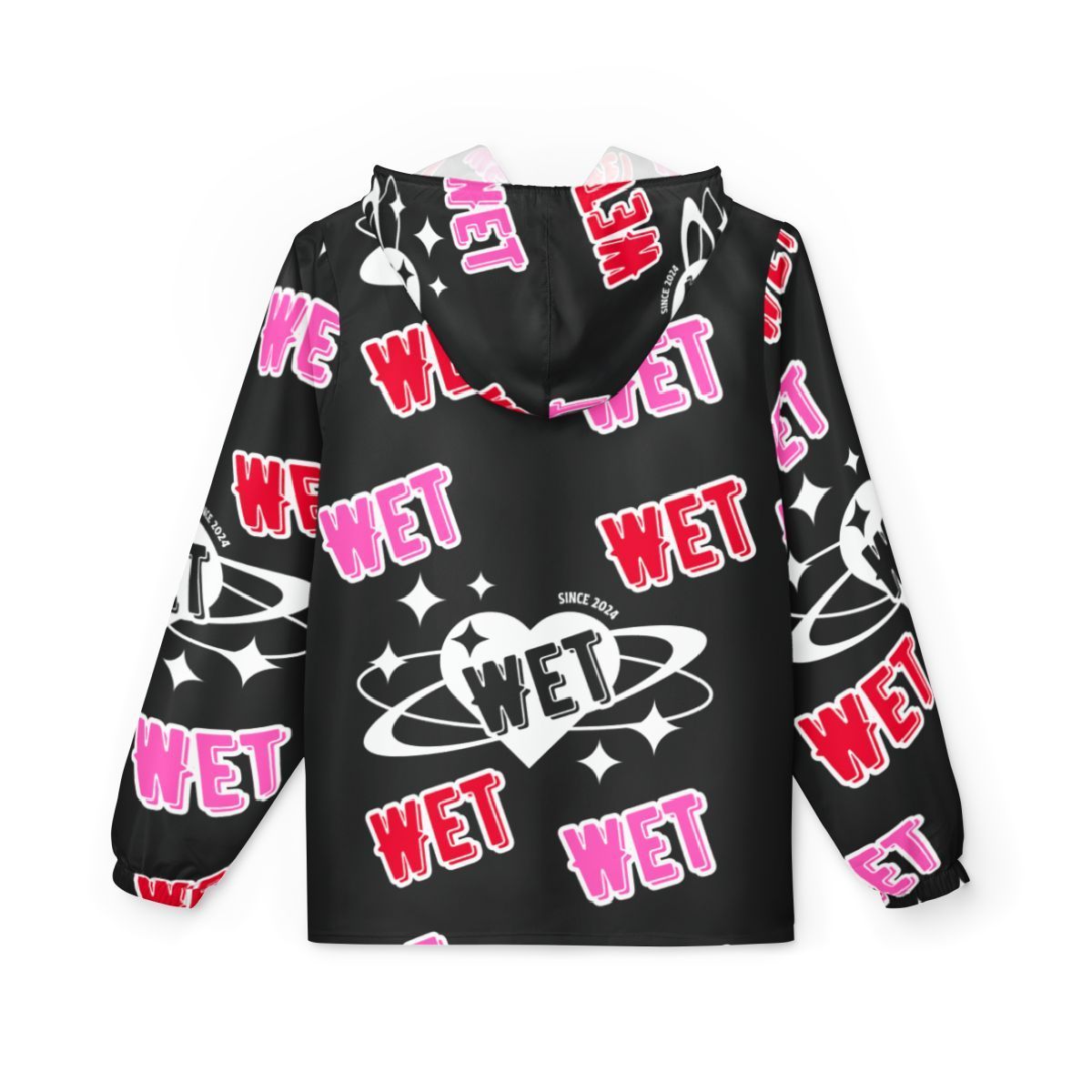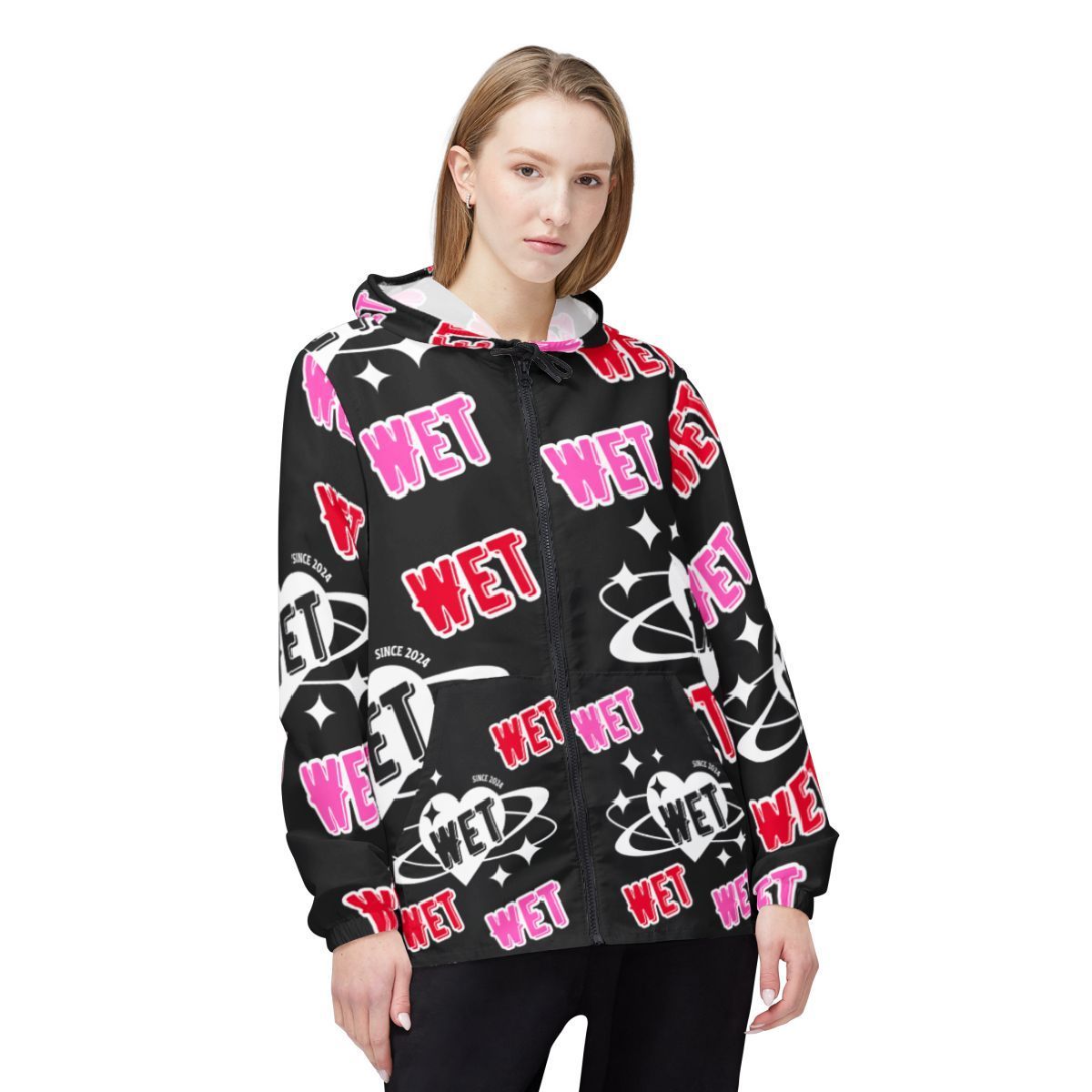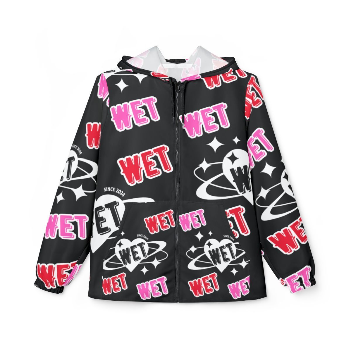 This lightweight windbreaker brings bold, street-ready energy to rainy days and city nights. The all-over print uses bright pinks, reds, and crisp white graphics on a deep black background — graffiti-style “WET” tags, planetary motifs, and sparkling accents that push a playful, rebellious vibe. With a hood and full zipper, it layers easily over hoodies or tees and sheds light drizzle and wind while keeping the design visible from every angle. It’s made to move with elastic cuffs and roomy side pockets for your essentials. Wear it when you want to stand out on wet walks, late-night meetups, or festival runs where weather and style both matter.