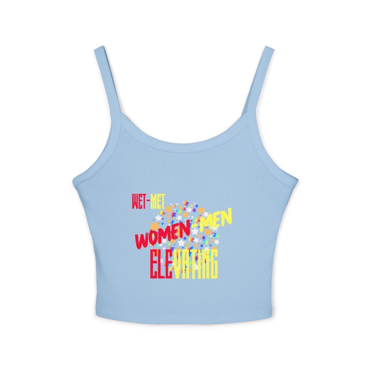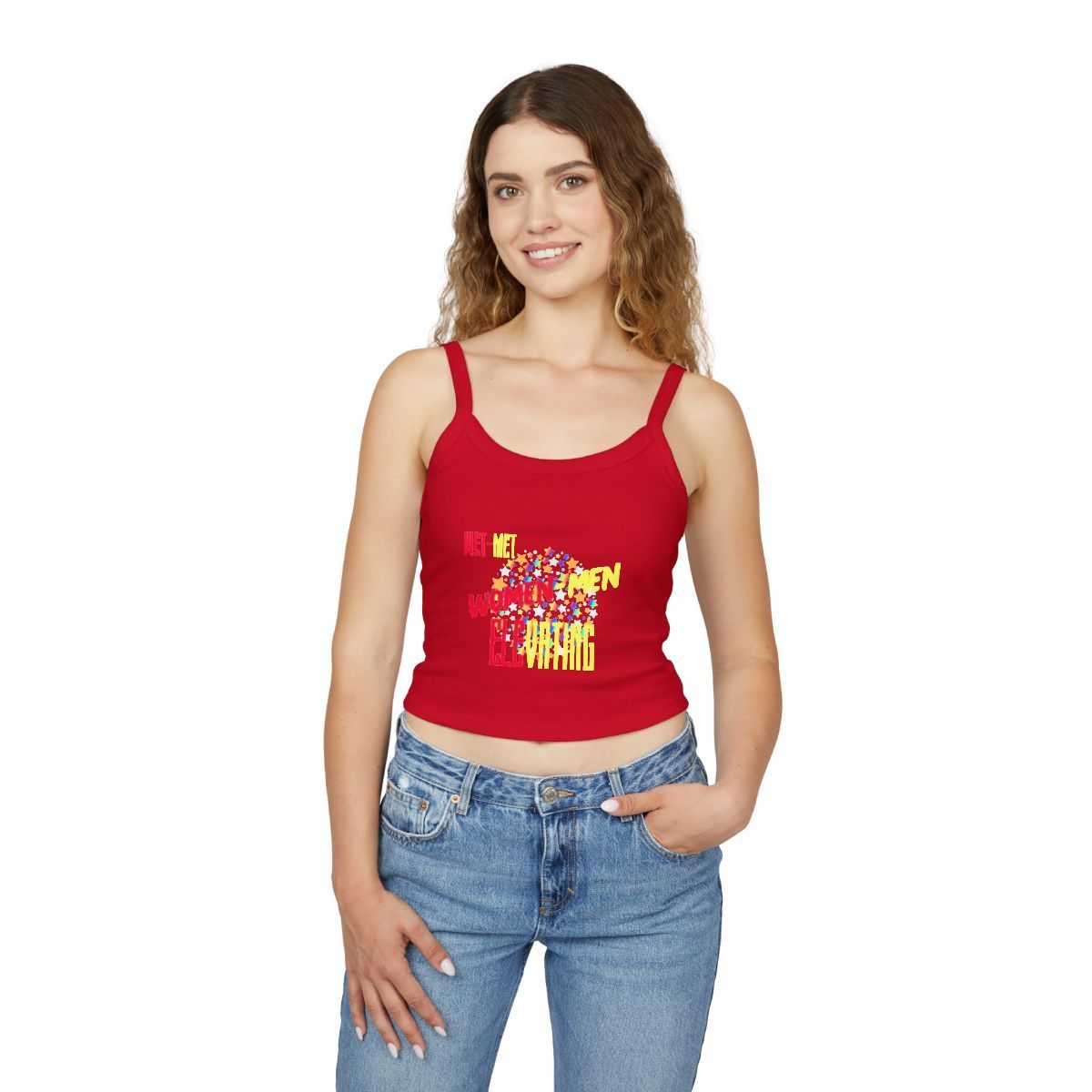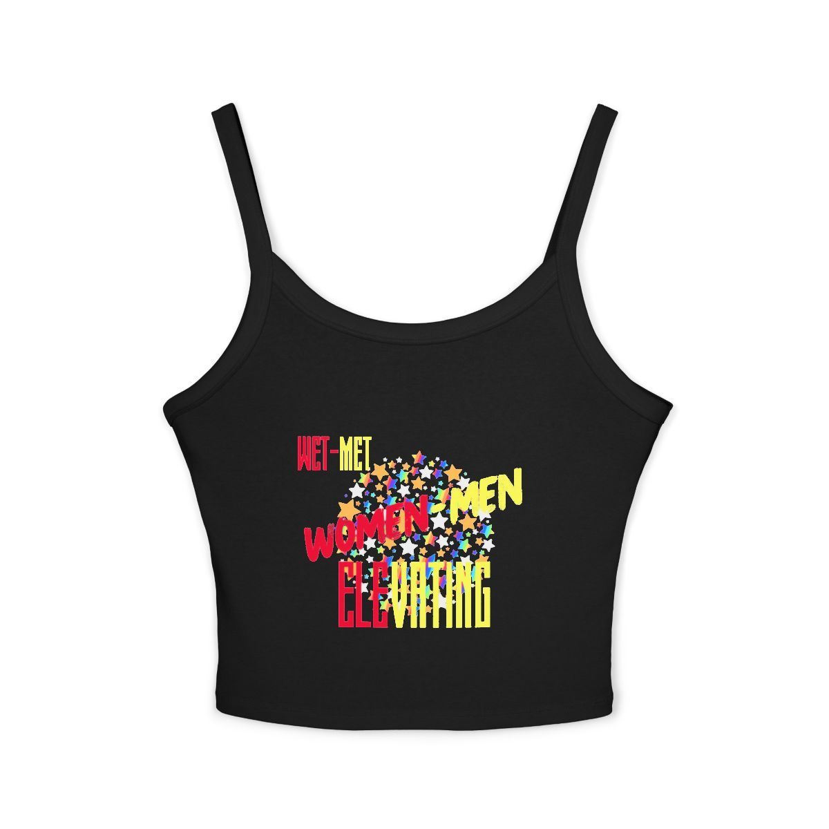 Light, bold, and playful — this fitted spaghetti-strap tank brings confident energy to warm days and layered looks. The soft Airlume cotton blend feels smooth against skin while the mid-length cut gives just enough coverage to move freely. Thick straps keep the top steady during errands, workouts, or late-afternoon meetups. The colorful, graphic-front print adds a cheerful, streetwise flair that pops on black fabric. Ethically produced with FLA and WRAP/Bluesign-certified partners, this tank sits comfortably in a wardrobe that cares about both style and values.