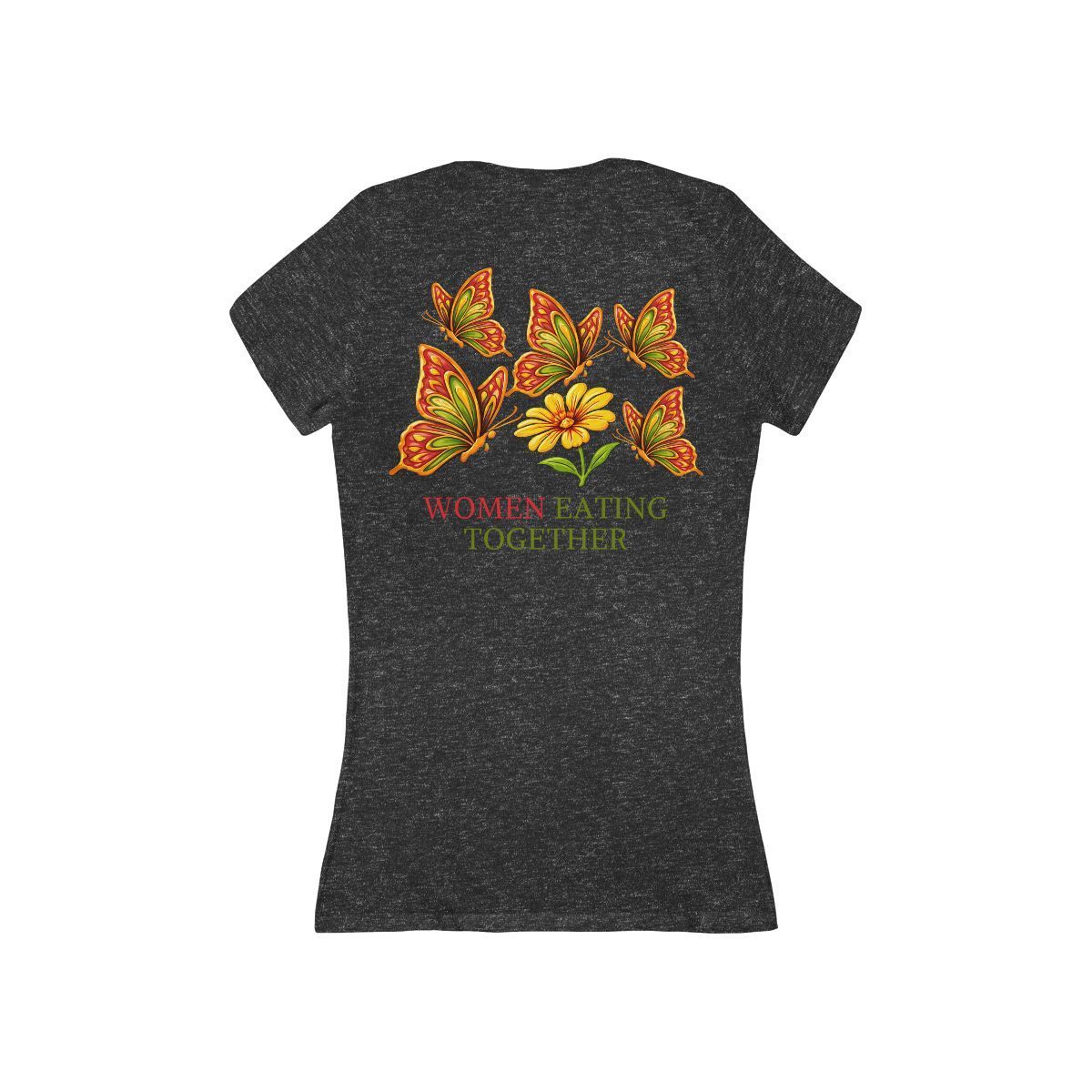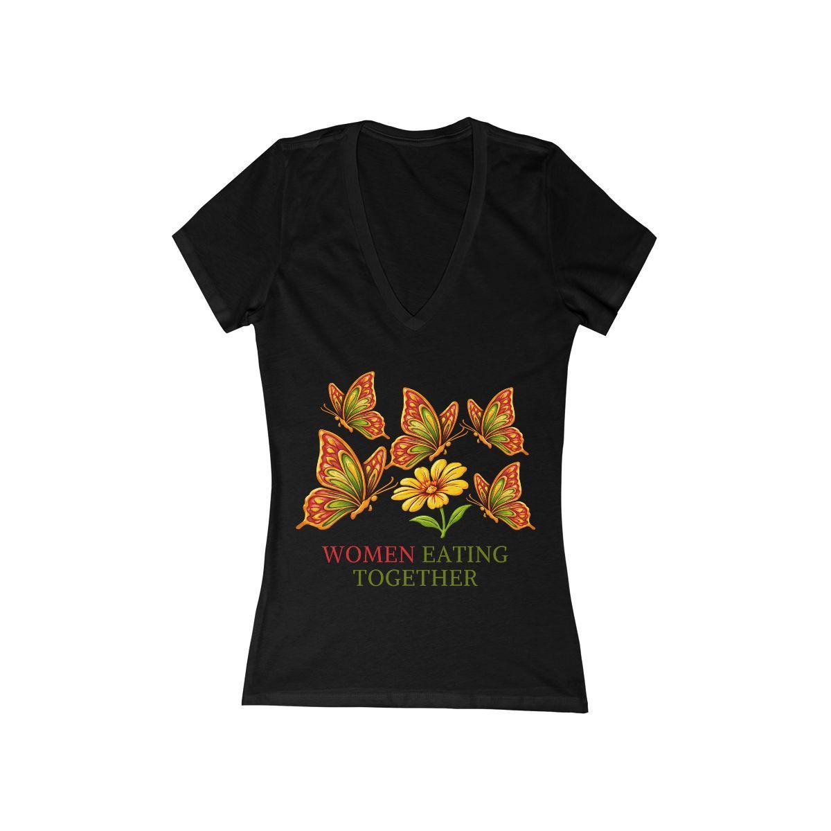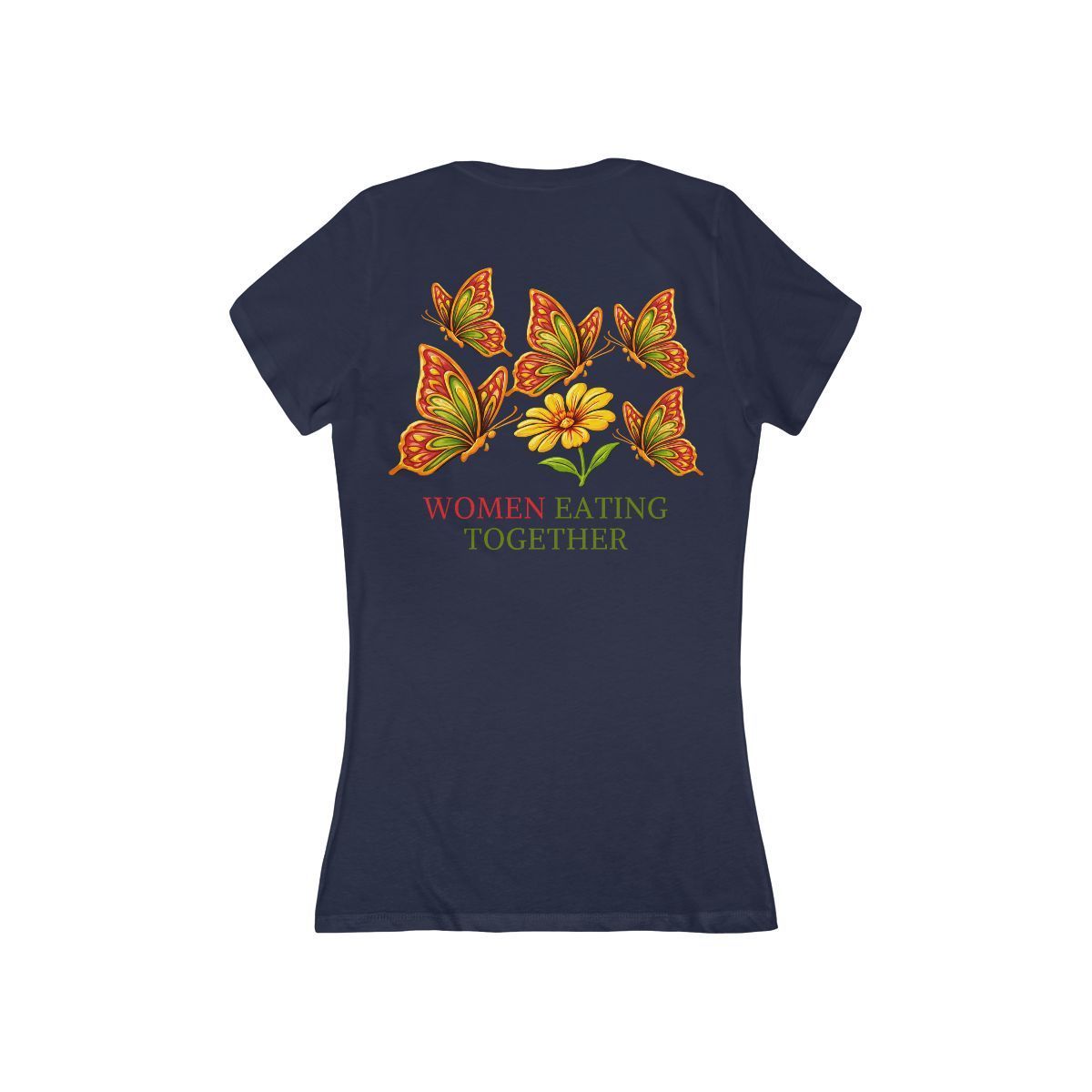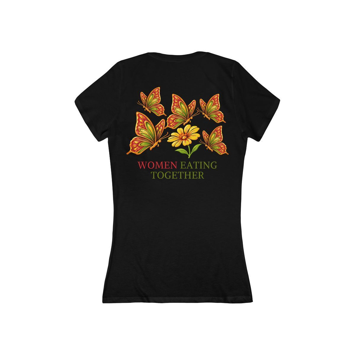 Light and airy, this slim-fit V-neck brings warm, botanical energy to everyday wear. Soft cotton drapes close to the body and moves with you, while a delicate cluster of orange-and-green butterflies arches above a single golden bloom. The phrase “WOMEN EATING TOGETHER” sits beneath the artwork in earthy, hand-printed lettering — a subtle nod to shared meals, conversation, and ritual. Wear it to low-key brunches, farmers’ market runs, or slow evenings spent cooking and catching up with friends. The narrow cut and deep neckline create a relaxed, intimate silhouette that layers well under a cardigan or stands on its own when the sun’s out.