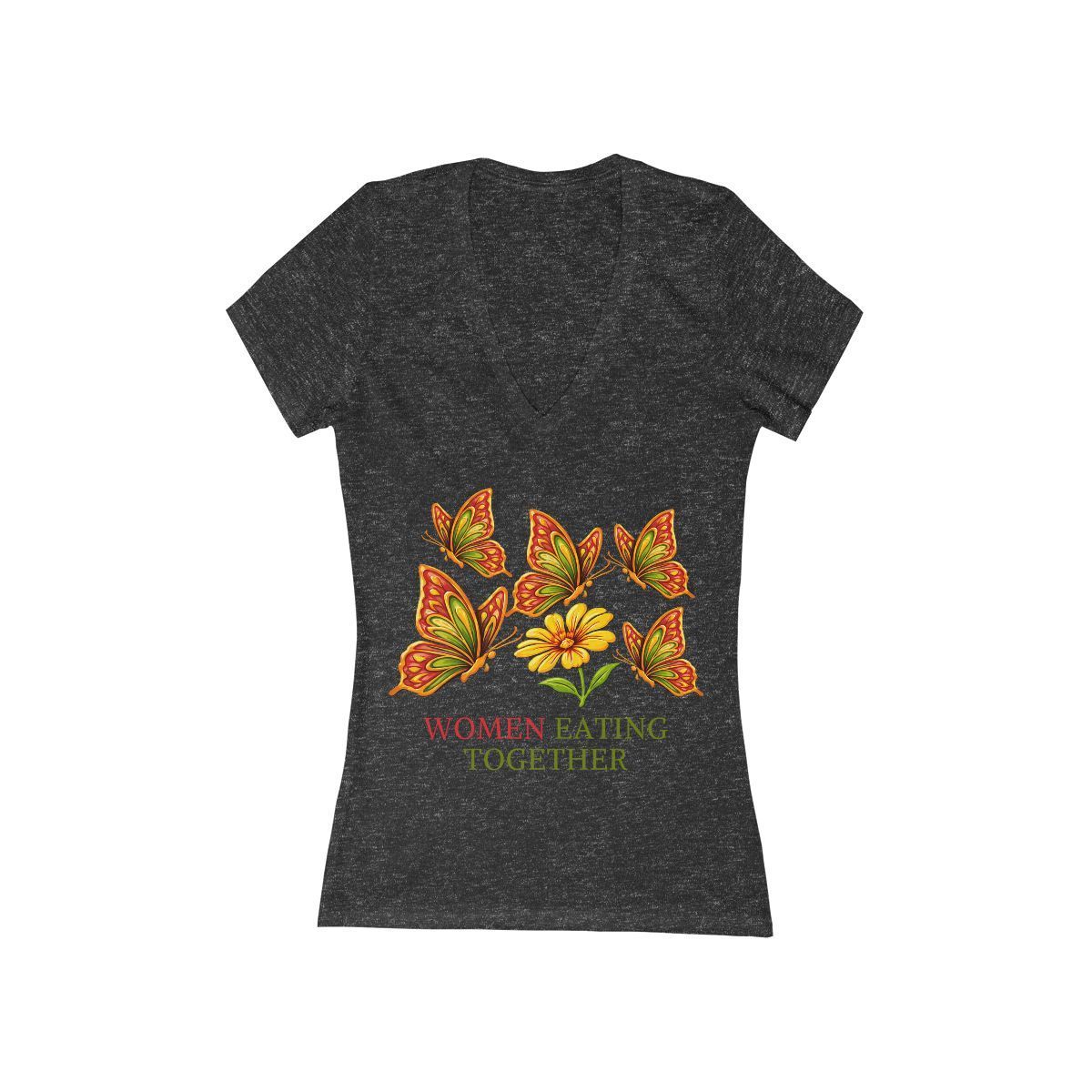 Women Eating Together V‑Neck Tee — Floral Butterflies Gathering